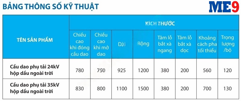 Bảng thông số kỹ thuật chi tiết Cầu dao phụ tải ngoài trời hộp dập dầu:
