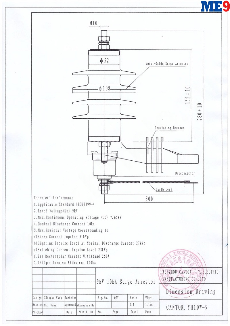 Chống sét van Cantor 9kV mã YH10W-9 là thiết bị điện trung thế dùng để bảo vệ lưới điện trung thế, thiết bị điện trung thế phía sau nó không bị đường sét lan truyền với điện áp cao gây hỏng cách điện, cháy nổ thiết bị. Chống sét van Cantor YH10W-9 được dùng để bảo vệ cho lưới điện và các thiết bị điện dưới 9kV.