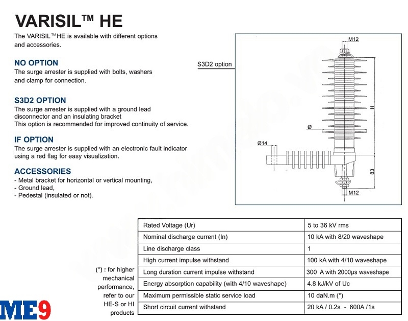 Chống sét van Tridelta 9kV, chống sét van Ensto 9kV HE 09 hay còn gọi là chống sét van trung thế 9kV - là thiết bị điện trung thế dùng để bảo vệ lưới điện trung thế, bảo vệ thiết bị điện trung thế phía sau nó không bị đường sét lan truyền với điện áp cao gây hỏng cách điện, cháy nổ thiết bị. Chống sét van Ensto HE 09 được dùng để bảo vệ cho lưới điện và các thiết bị điện lưới 9kV.