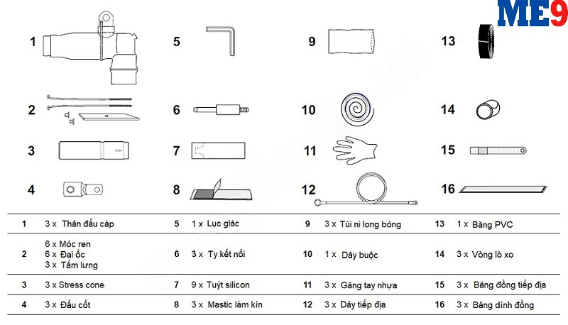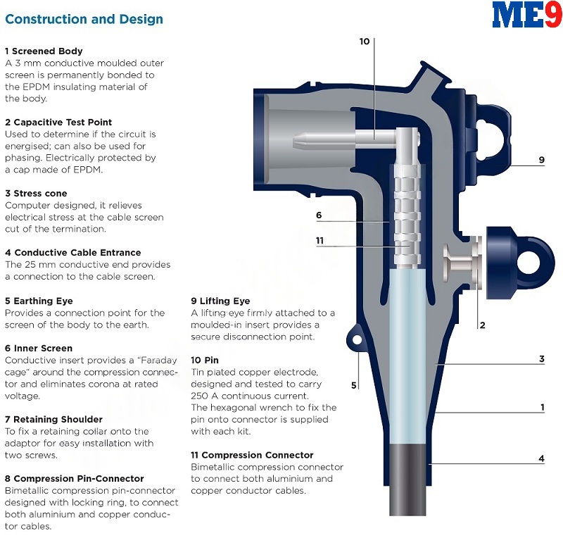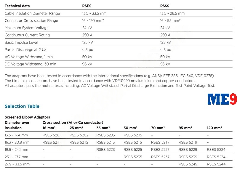 - Đầu cáp Elbow Raychem 24kV 250A RSES 52XX là đầu cáp làm bằng chất liệu cao su cách điện EPDM. Nó được thiết kế phù hợp với tất cả các loại cáp trung áp có cấu trúc màn chắn kim loại, có hoặc không có giáp, lõi dẫn bằng đồng hoặc nhôm điện áp đến 24kV.