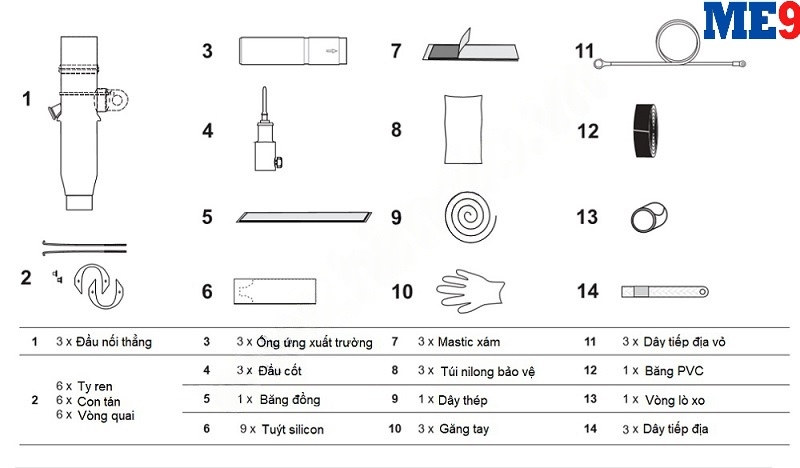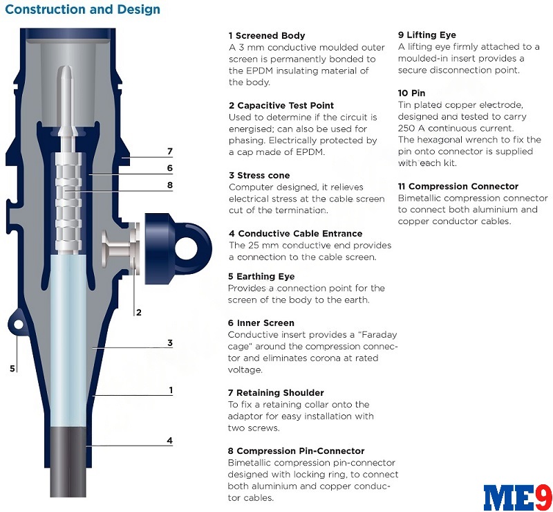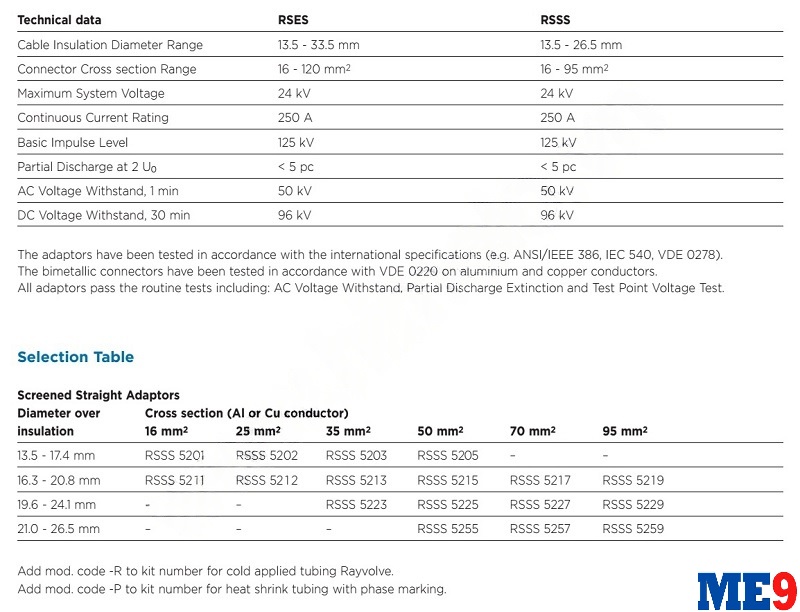 - Đầu cáp nối thẳng (Straight) Raychem 24kV 250A RSSS 52XX là đầu cáp làm bằng chất liệu cao su cách điện EPDM. Nó được thiết kế phù hợp với tất cả các loại cáp trung áp có cấu trúc màn chắn kim loại, có hoặc không có giáp, lõi dẫn bằng đồng hoặc nhôm điện áp đến 24kV.