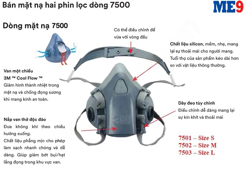 Mặt Nạ Nửa Mặt 3M™ 7501, 7502, 7503 - Bán mặt nạ sử dụng nhiều lần dòng 7500 với vật liệu Silicone giúp tạo cảm giác thoải mái và sự ổn định trong bảo vệ hô hấp. Hệ thống van một chiều 3M™ Cool Flow™ Valve giúp thở dễ dàng hơn và giảm độ nóng cũng như độ ẩm, tạo cảm giác mát và thoải mái. Các size: 7501/ Cỡ Nhỏ - 7502/ Cỡ Trung - 7503/ Cỡ Lớn.