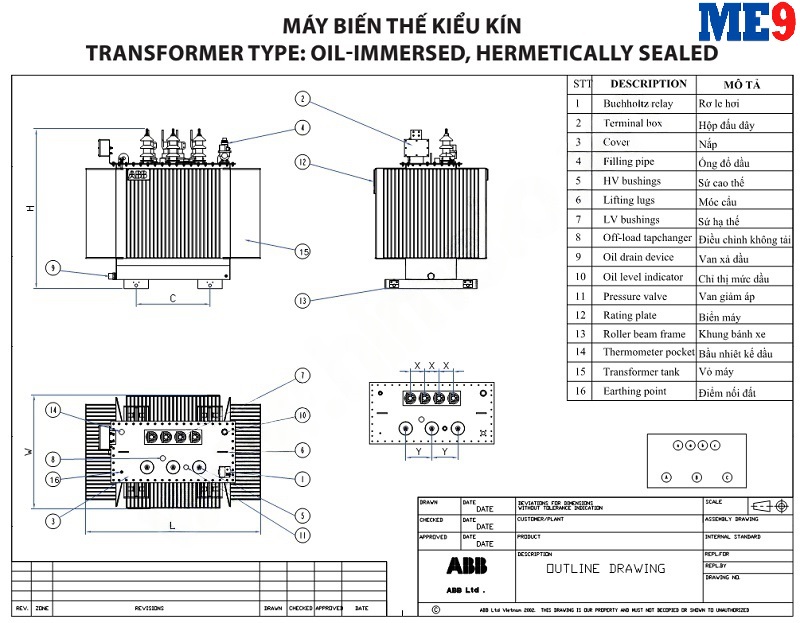 Máy biến áp dầu ABB là loại máy biến áp mà ở đó các cuộn dây trung thế và các cuộn dây hạ thế đều được cách điện với nhau bằng dầu cách điện. Máy biến áp này hay được gọi là máy biến áp ngâm dầu. Trong đó máy biến áp dầu kiểu kín ABB 22kV là một loại máy biến áp ngâm dầu của hãng ABB dùng cho lưới điện 22kV, được sản xuất theo tiêu chuẩn cấp cách điện 24kV và là loại kín hay còn gọi là máy biến áp không có bình dầu phụ.