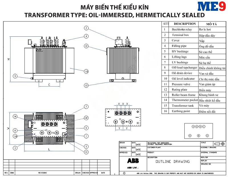 Máy biến áp dầu ABB là loại máy biến áp mà ở đó các cuộn dây trung thế và các cuộn dây hạ thế đều được cách điện với nhau bằng dầu cách điện. Máy biến áp này hay được gọi là máy biến áp ngâm dầu. Trong đó máy biến áp dầu kiểu kín ABB 35kV là một loại máy biến áp ngâm dầu của hãng ABB dùng cho lưới điện 35kV, được sản xuất theo tiêu chuẩn cấp cách điện 36kV và là loại kín hay còn gọi là máy biến áp không có bình dầu phụ.