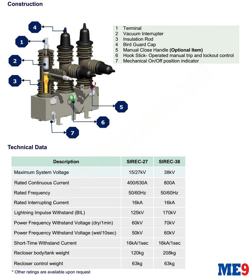 Máy cắt tự đóng lại Auto-Recloser Shinsung 27kV mã SIREC là 1 loại máy cắt có khả năng tự đóng lặp lại nhờ cài đặt chương trình bảo vệ từ tủ điều khiển bảo vệ đi kèm máy cắt. Máy cắt tự đóng lại Auto-Relcoser Shinsung 27kV SIREC được thiết kế để đáp ứng các yêu cầu sử dụng bảo vệ phụ tải và đường dây trên không với cấp điện áp lên đến 27kV (22kV, 23kV, 24kV).