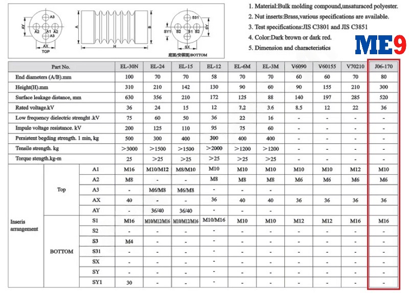 Sứ đỡ thanh cái trung thế 36kV mã J06-170 - là sứ được làm bằng chất liệu nhựa resin epoxy với độ bền cao, được sử dụng trong nhà trong tủ điện hoặc trên giá để đỡ thanh cái. Sứ đỡ thanh cái trung thế 36kV mã J06-170 được dùng cho lưới điện cấp điện áp đến 36kV, thông dụng là dùng cho điện áp 35kV và 36kV.